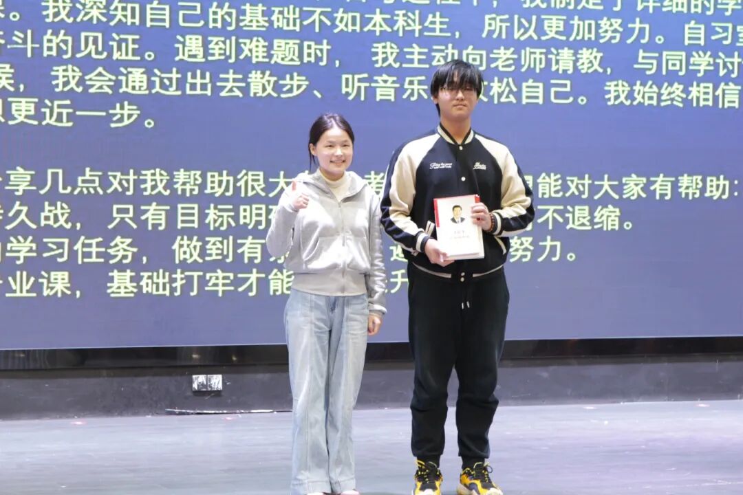 史翠侠同学向学弟学妹赠送代表知识传承的书籍,并分享专升本成功经验。她告诉同学们要学会“善用资源”,多追着师长问出困惑、把网课与资料用成“随身锦囊”;更要做好“心态调节”,接纳情绪后再带着乐观重新出发。