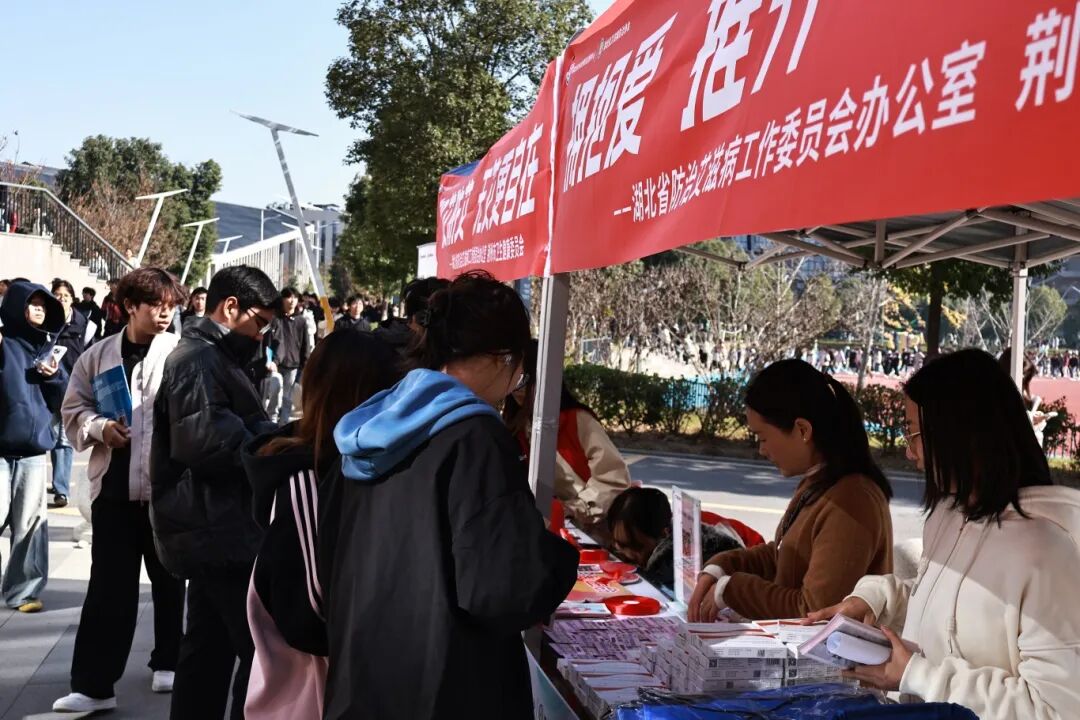 在第38个世界艾滋病日来临之际,为深入贯彻“社会共治,守正创新,终结艾滋”的全国宣传主题,推动校园防艾教育走深走实、落地见效,我校于11月26日在一食堂门前成功举办“拥抱爱,推开‘艾’”防艾主题宣传教育活动。本次活动由湖北省疾病预防控制中心、湖北省艾滋病防治协会、荆州市卫生健康委员会与我校联合主办,面向全体在校学生,以“互动式体验+知识型传播”的创新形式,实现了防艾知识普及与健康理念传递的双重目标,为我校2025年防艾系列工作注入青春活力与实践力量。